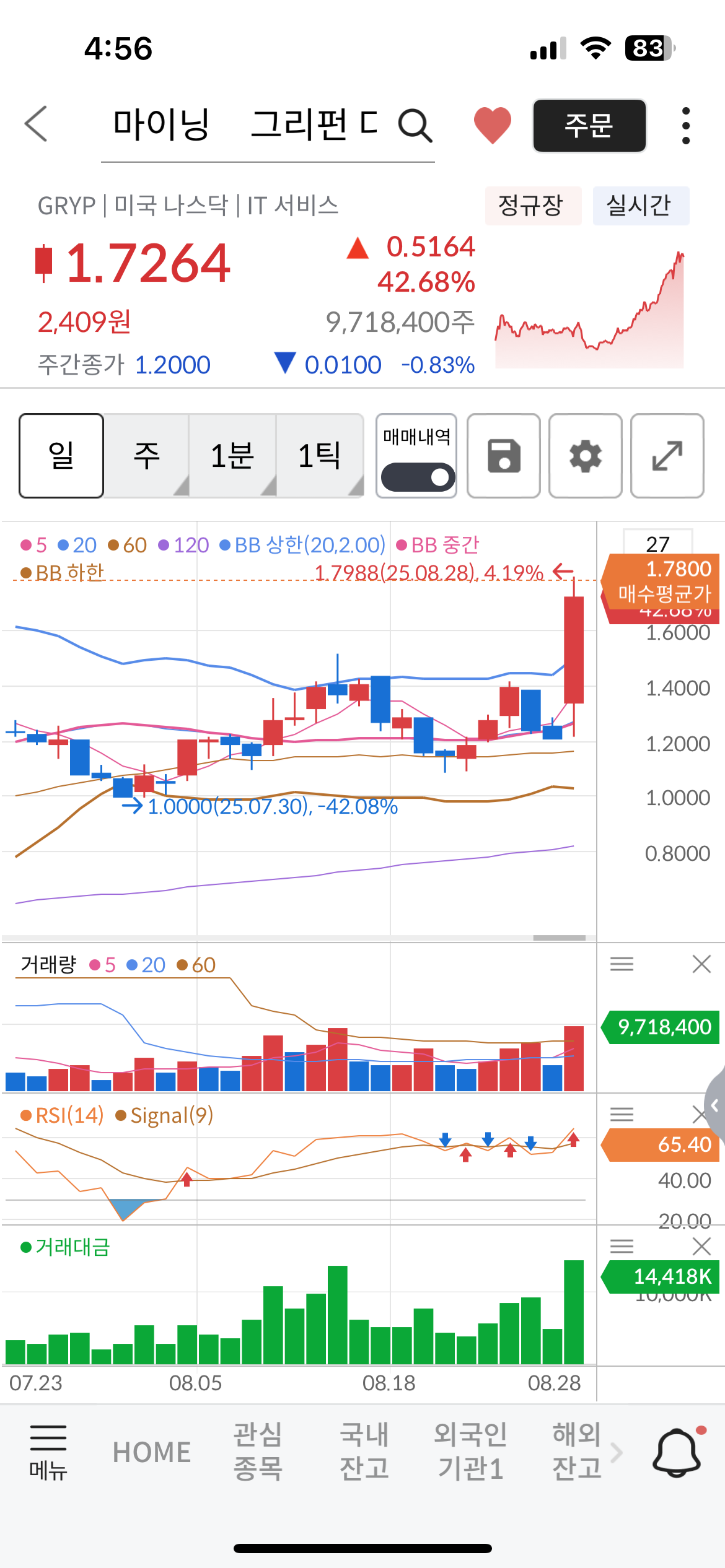 그래서 그리펀 디지털 마이닝(GRYP)을 1.78불에 매수, 1.87에 매도하여 5%정도 먹었다