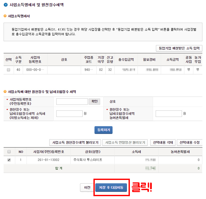 아까는 비어있던 수입금액, 소득금액 공간에 숫자가 들어왔죠? 확인 후 다음으로 이동합니다!