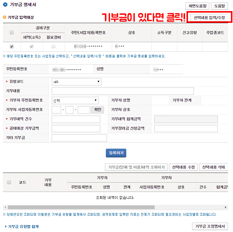 기부금이 있다면 선택 내용 입력/수정을 눌러 기부금 내역을 조회 후 입력합니다. 조회가 되지 않는다면 직접 내용을 입력 후 "등록하기"를 누릅니다!