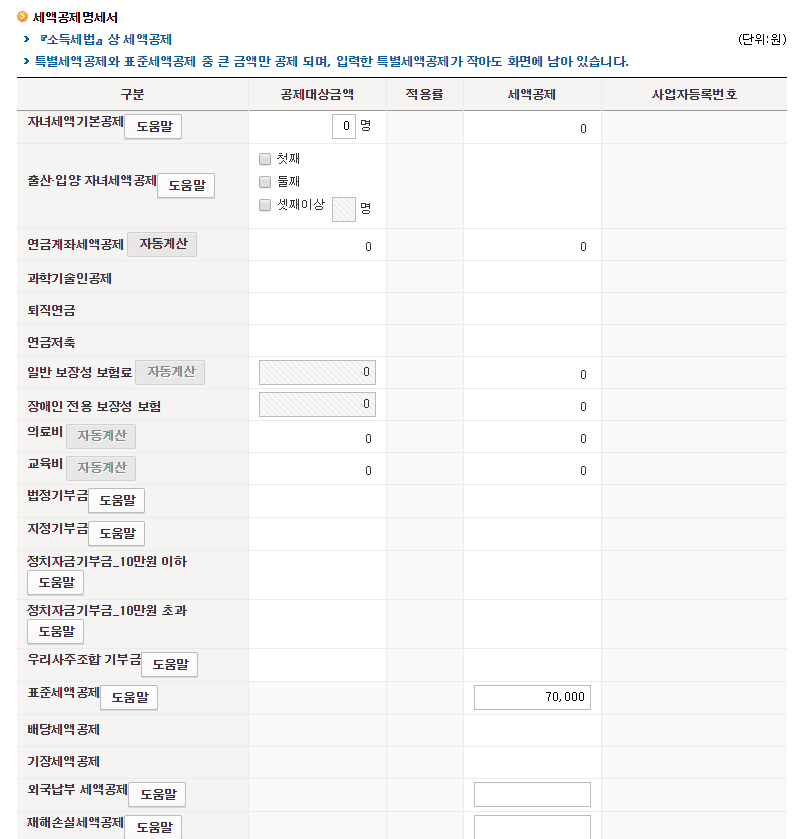 여기에 보시면 표준 세액공제에 7만 원이 찍혀있는데 이것은 제가 근로자가 아닌 소득이 있는 사람으로서 특별 세액공제를 신청하지 않았기 때문에 공제해주는 금액입니다. 특별 세액이나 표준 세액 중 큰 금액을 공제해준다고 하고 근로자라면 13만 원을 공제해준다고 합니다. 단! 근로자는 특별 세액공제 포함 월세액, 의료비, 교육비 등의 세액공제 신청을 하지 않은 사람이어야 가능하다고 해요!