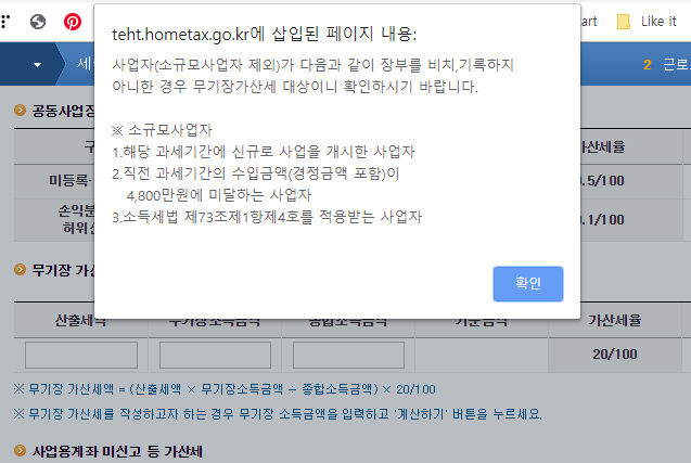 다음으로 이동하면 이렇게 팝업이 뜨면서 무기장가산세에 대한 안내를 합니다! 말 그대로 장부를 기록하지 않아서 그에 대한 가산세를 매긴다는 것인데 저희는(?) 저는! 소규모 사업자에 해당해서 무기장 가산세가 0원이므로 크게 신경 쓰지 않으셔도 됩니다! (혹시.. 2017년도 수익이 4,800만원 이상이시라면!? 계산을 하셔서 입력하셔야 합니다^^; 근로소득은 여기 해당되지 않고요!)