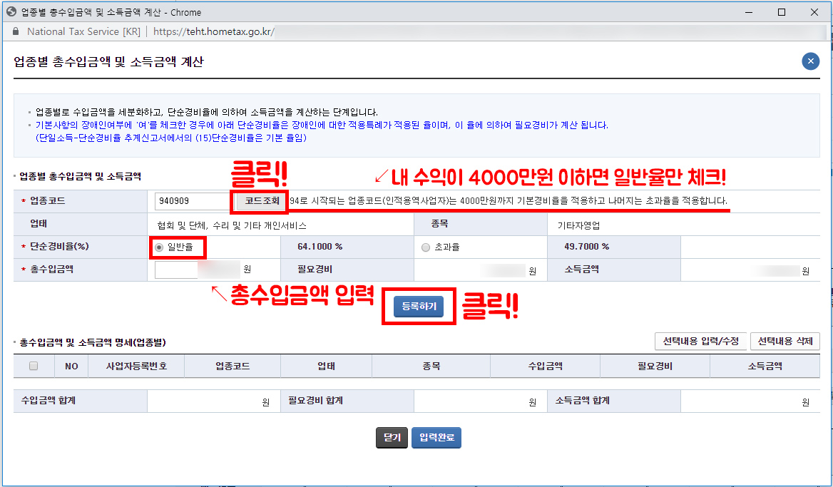 2) 만약 내 수익이 4,000만 원 이하라고 하면 일반율에만 체크를 누르시고 총수입금액을 입력하시면 됩니다.