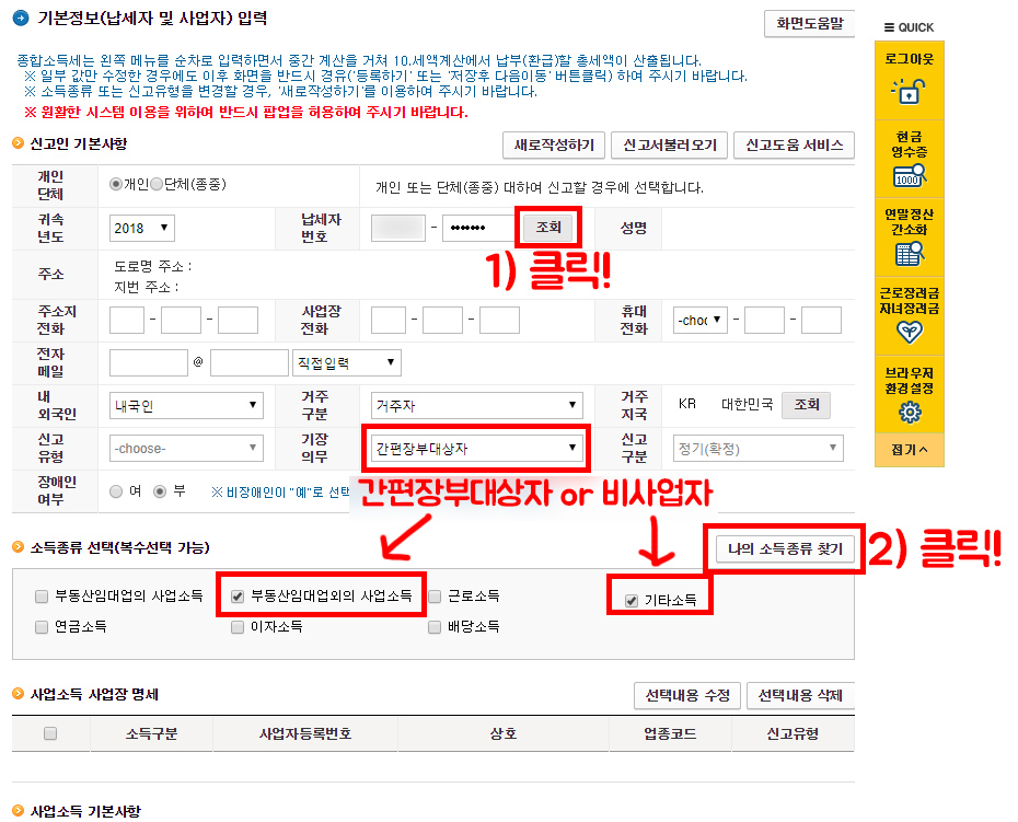 1) 우선 업종코드 940909를 입력 후 코드조회를 누르고 "총수입금액"에 투네이션 총 정산 금액을 적습니다.(2018년도)1) 아프리카/트위치 방송만 하시며 도네 받으시는 분들은 940306 입력, 사무실이나 직원이 있는 MCN회사 또는 유튜버 분들은 921505 입력 후 코드조회를 누르고 "총수입금액"에 투네이션 총 정산 금액을 적습니다.