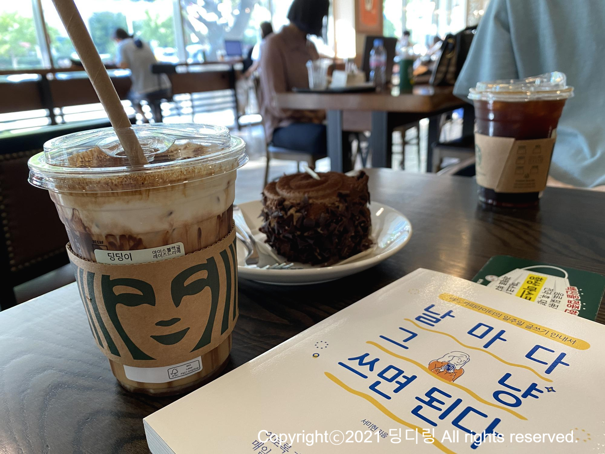 책을 보려고 왔으니 사이즈는 그란데로 하고 빈속으로 왔으니 달달한 케이크도 시켜야지.
